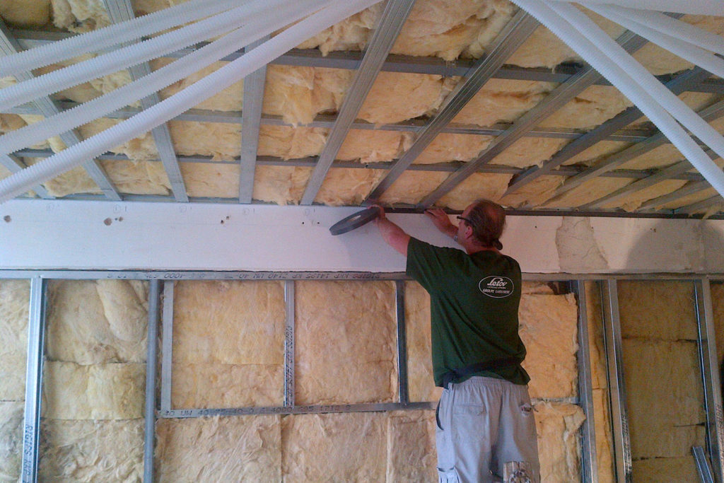 Domů » Odhlučnění » Doporučené pracovní postupy » Montáž stropu s dvojitým roštem